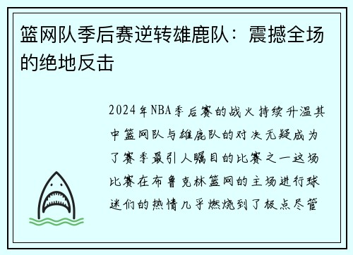 篮网队季后赛逆转雄鹿队:震撼全场的绝地反击