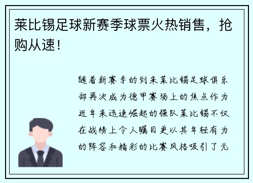 莱比锡足球新赛季球票火热销售,抢购从速!